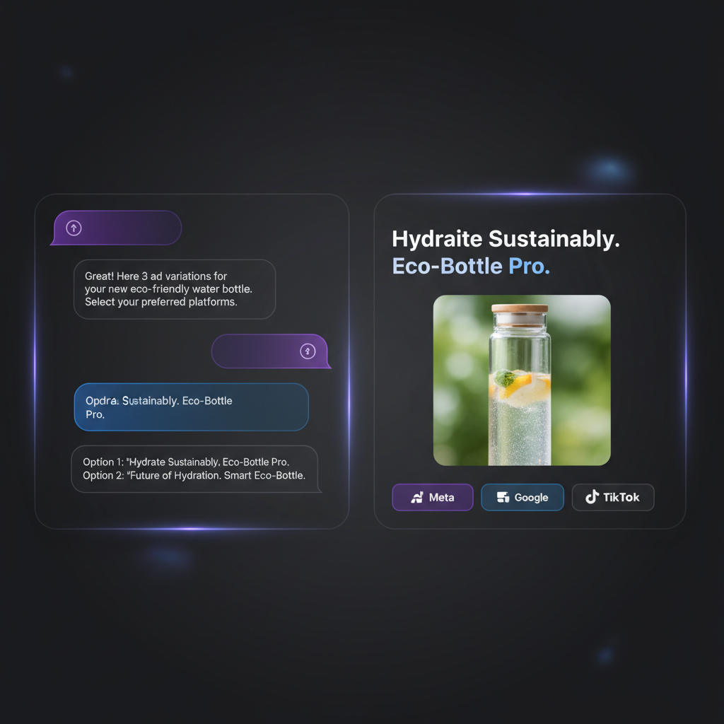 Zarządzaj kampaniami jak profesjonalista. Generuj kreacje i teksty przez czat z AI, a następnie publikuj jednym kliknięciem na Facebooku, Google, TikToku i innych.