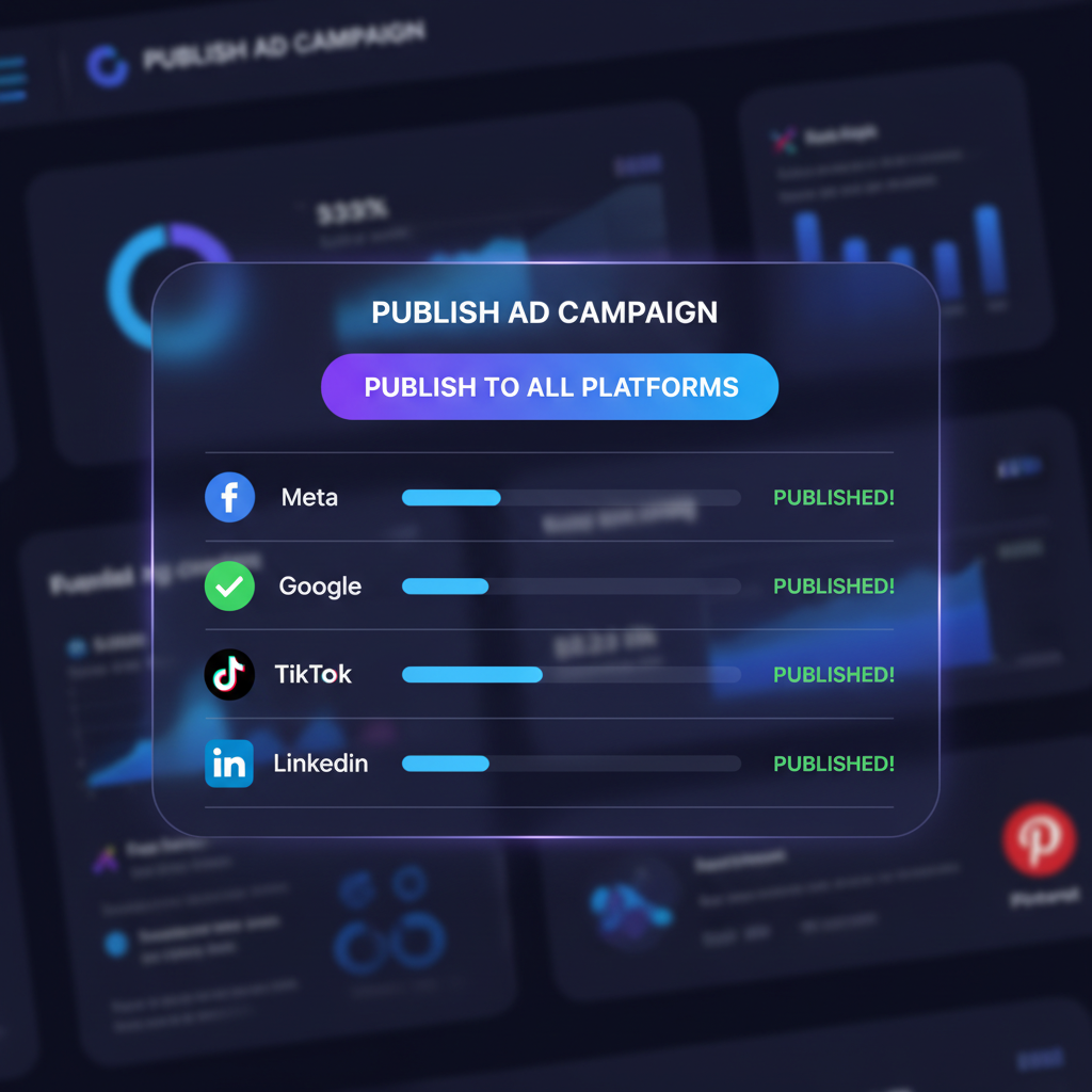 Koniec z ręcznym kopiowaniem i wklejaniem na każdej platformie. Wybierz gotowe warianty, określ budżet i jednym kliknięciem roześlij kampanię na Facebook, Google, TikTok czy LinkedIn jednocześnie.